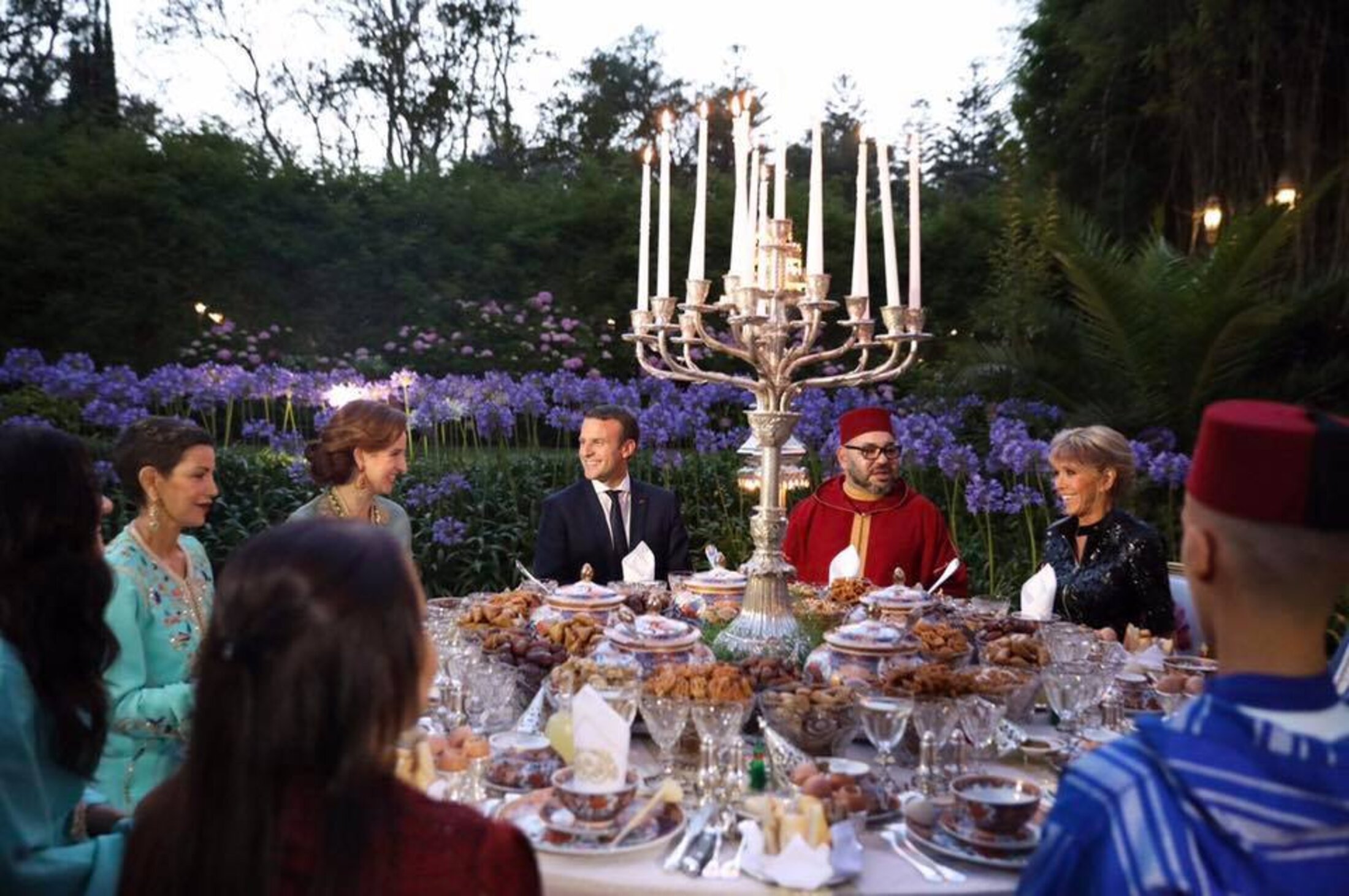 In the photo a huge chandelier dominates the middle of the table. Emmanuel Macron and his wife Brigitte are sitting either side of King Mohammed VI, who is dressed in red with gold embroidery. Behind them the agapanthuses are in full bloom. In front of them on the table is expensive crockery and some refined typical Ramadan food dishes. This is June 2017 and the new French president has chosen Morocco for his first visit outside Europe after his recent election.