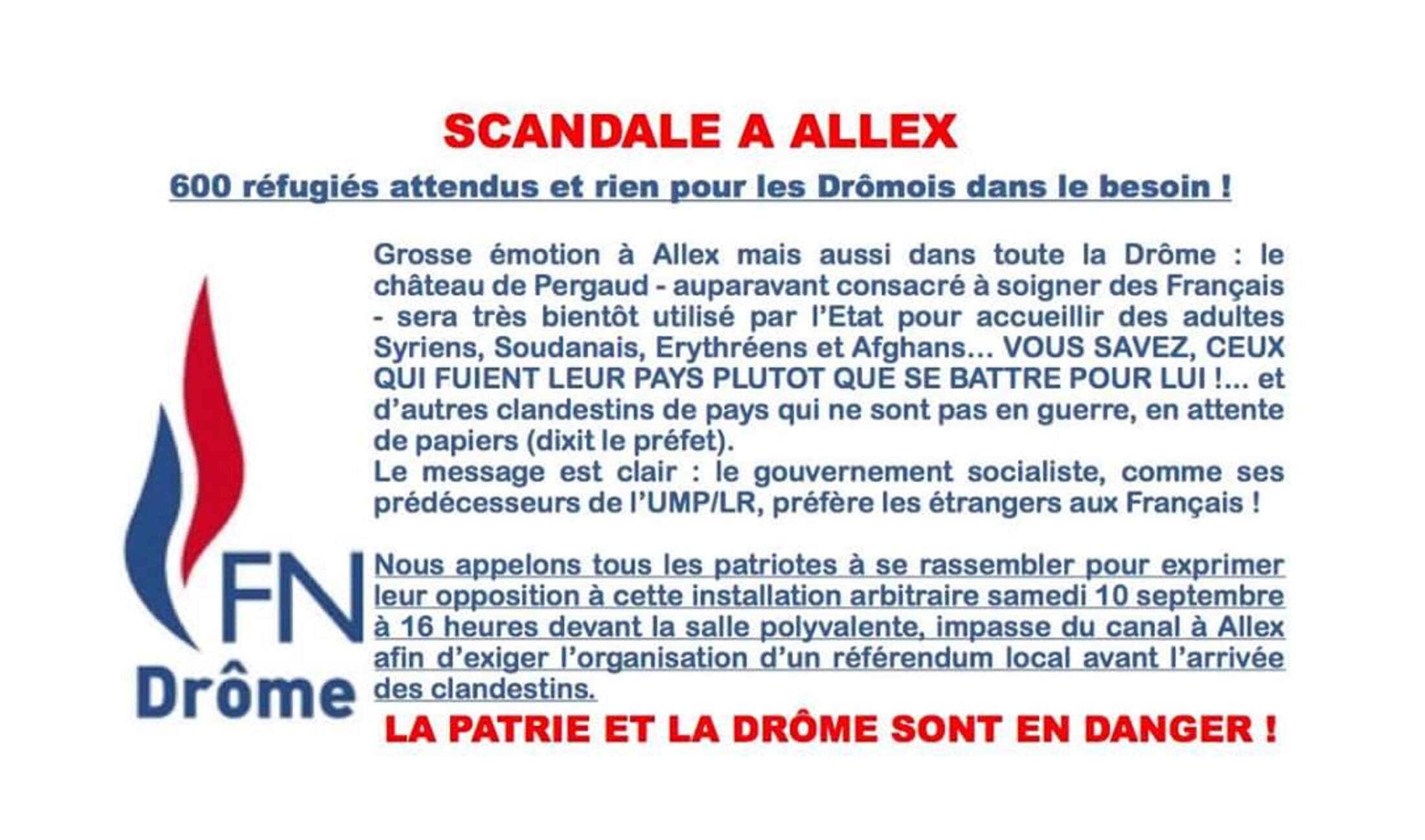 On flyers handed out in the streets the day before, the National Front called for the organization of a referendum to prevent the arrival of what it called “those who flee their country rather than fight for it”. No-one Mediapart talked to could remember the Front National mounting an operation as large as that in the region. “The government is hiding migrants in far-flung countrysides, this invasion must be stopped,” said Frédéric Marcel, a Front National official and party secretary for a constituency in the Drôme, who was present at the September 13th meeting of the Allex municipal council when the referendum was decided. “We are the only party to help the population of Allex defend itself and we are happy that our demand for the organization of a consultation was acted upon,” said Marcel.