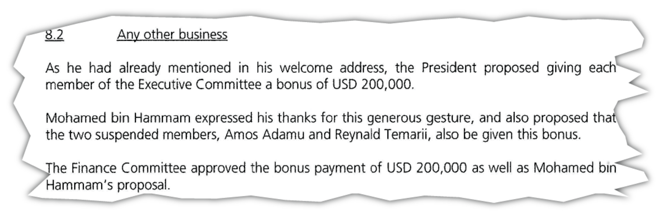 During that November 30th meeting, then FIFA president Sepp Blatter came in person to propose that all the members of FIFA’s executive committee should receive a bonus of 200,000 dollars, which was also approved (see the relevant extract from the minutes below).