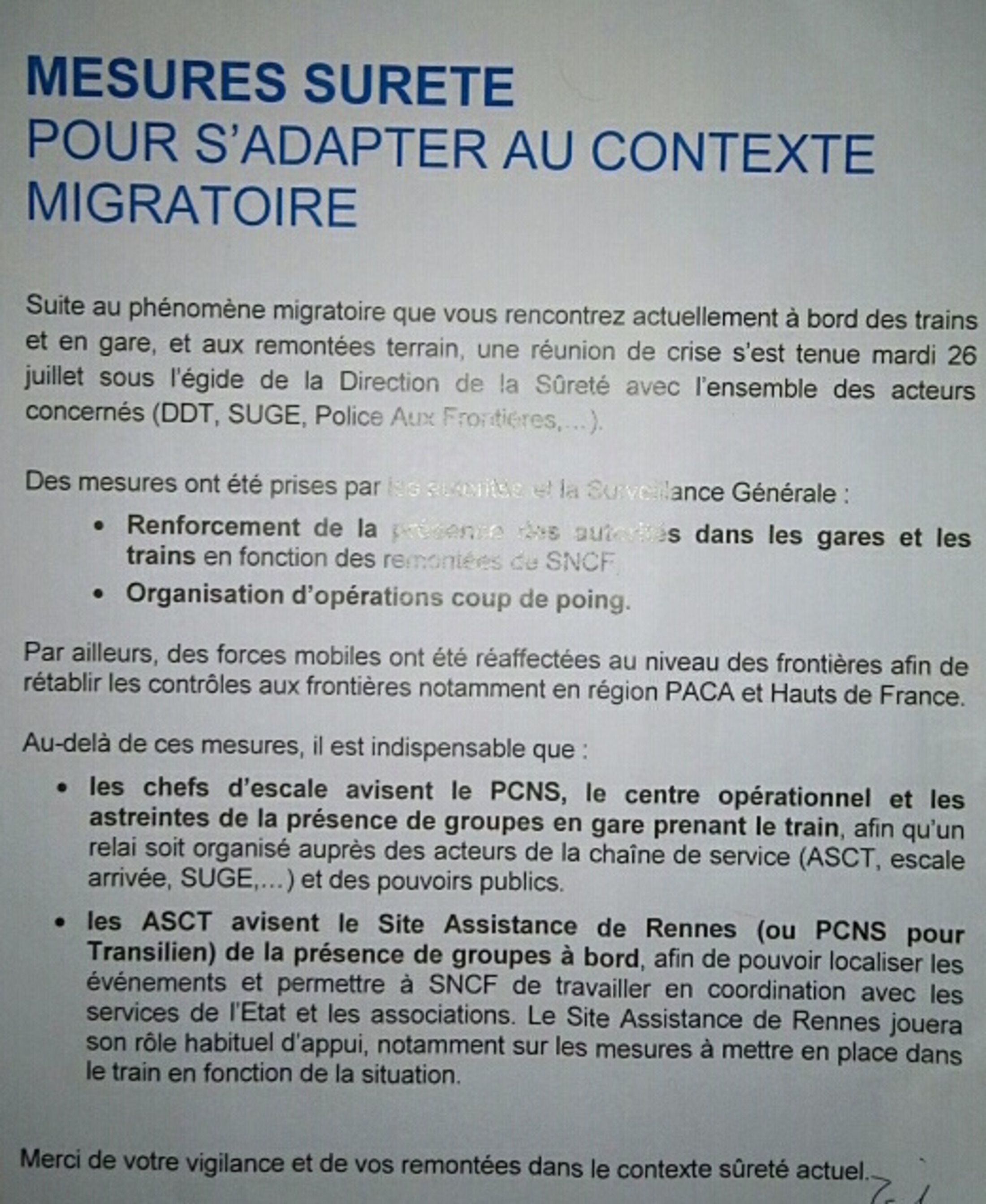 Mediapart obtained an undated SNCF internal memorandum (see above) entitled "Security measures to adapt to the migration context" which is circulated in the Provence-Alpes-Côte d'Azur (PACA) region which includes the border area in question. It calls on station managers and ticket inspectors to report the presence of "groups in stations catching the train", or “onboard”, to the rail operator's National Security Command Post (PCNS) "to be able to localise events and allow the SNCF to work in coordination with public services and associations".