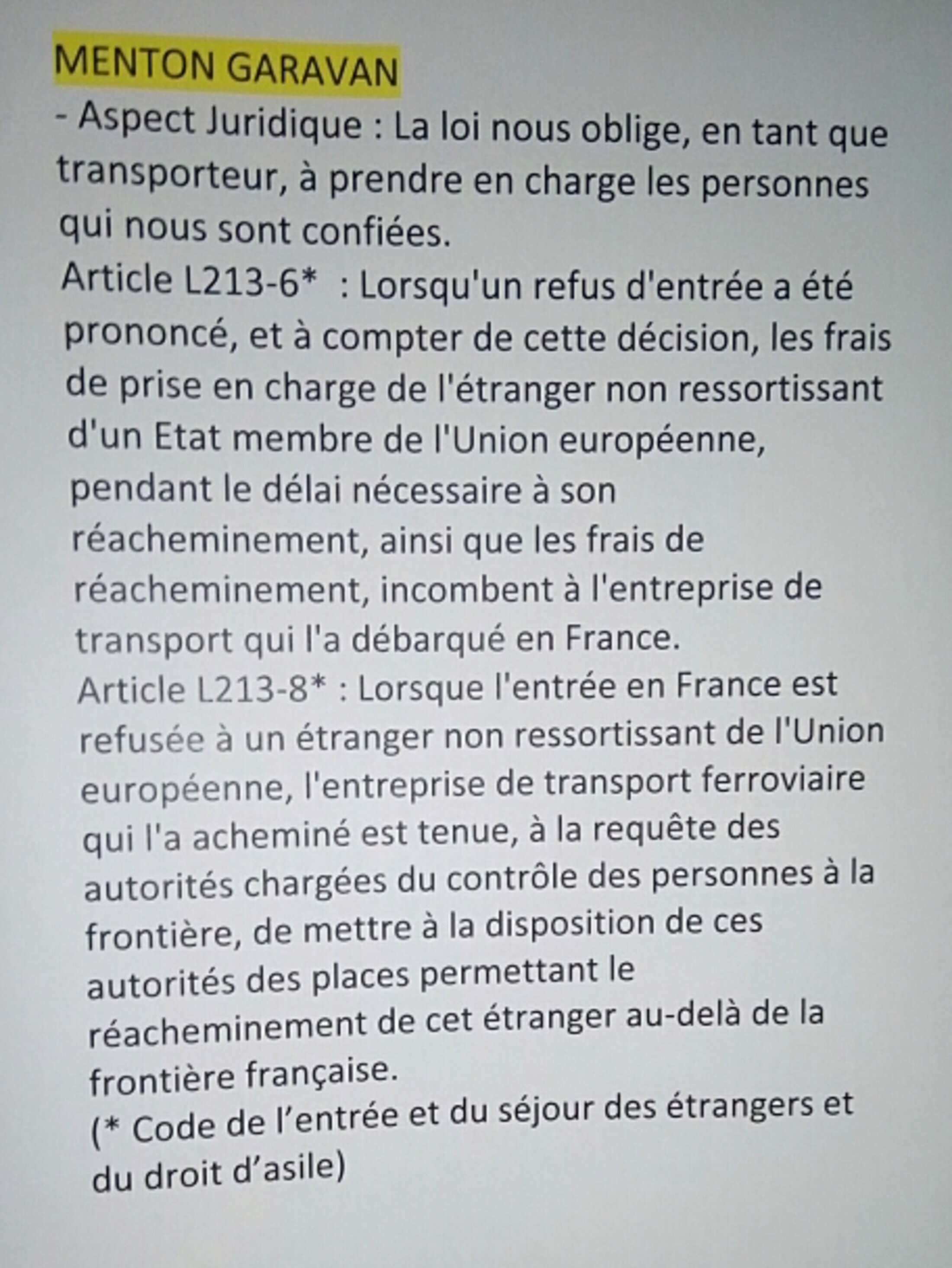 Migrants held by the police at Menton-Garavan are sent back across the border to Italy by train: the detained are put on the last train to Ventimiglia, in groups of 30, without tickets or any other formalities. At Nice central station, the SNCF has posted a notice (see below) in the ticket inspectors’ staff room which underlines the legal requirement that transporters must “take charge of those persons who are entrusted to us”. Under French law, when a foreign national from a non-European Union member state is refused entry to France “the railway company who transported him is required, on request of the authorities […] to place at the disposition of the said authorities seats to allow the transport of the foreign national beyond the French border”.