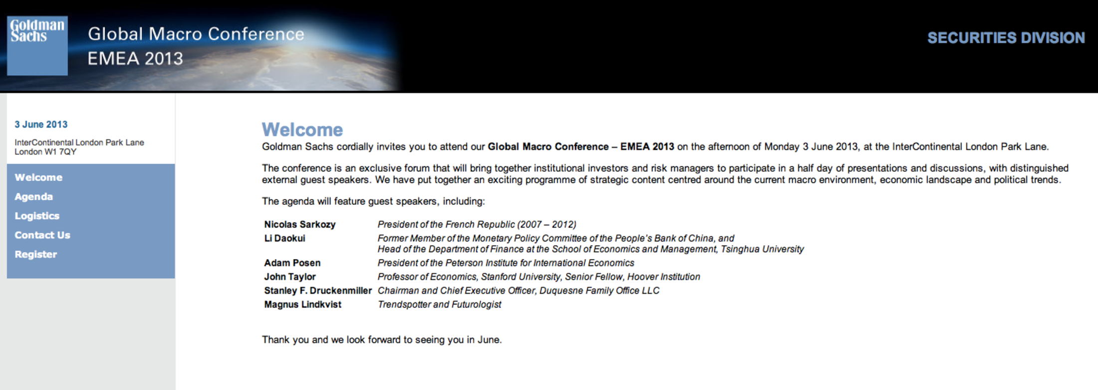 As announced on the bank’s website, Sarkozy is to be one of the “distinguished” speakers at Goldman's Global Macro Conference held at the Intercontinental Hotel in London on June 3rd.
