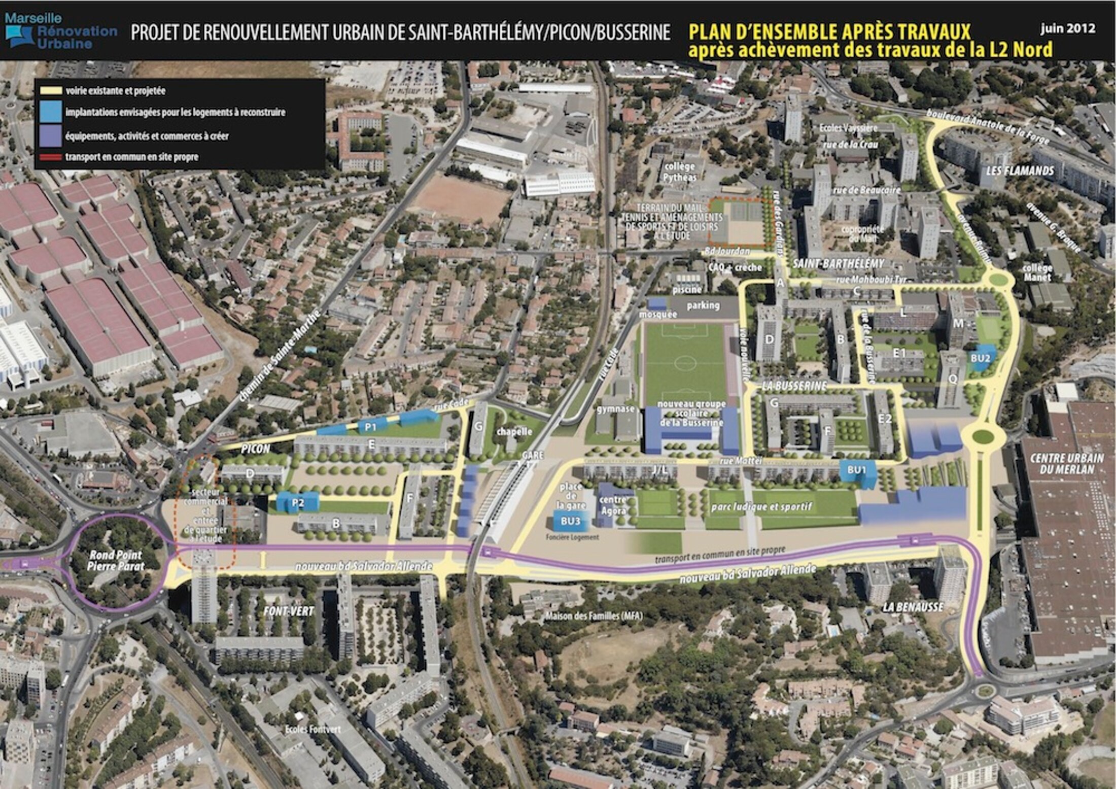 Le Grand Saint-Barthélemy, c’est un ensemble de huit cités HLM (Busserine, Saint-Barthélemy 3, Picon, Le Mail, Les Flamants, Iris, Font-Vert et Benausse), construites dans les années 1960 sur les ruines du plus grand bidonville de Marseille. Situées sur les hauteurs de la ville, certaines de ses cités ont gardé le nom des bastides qui jalonnaient autrefois cette campagne marseillaise.