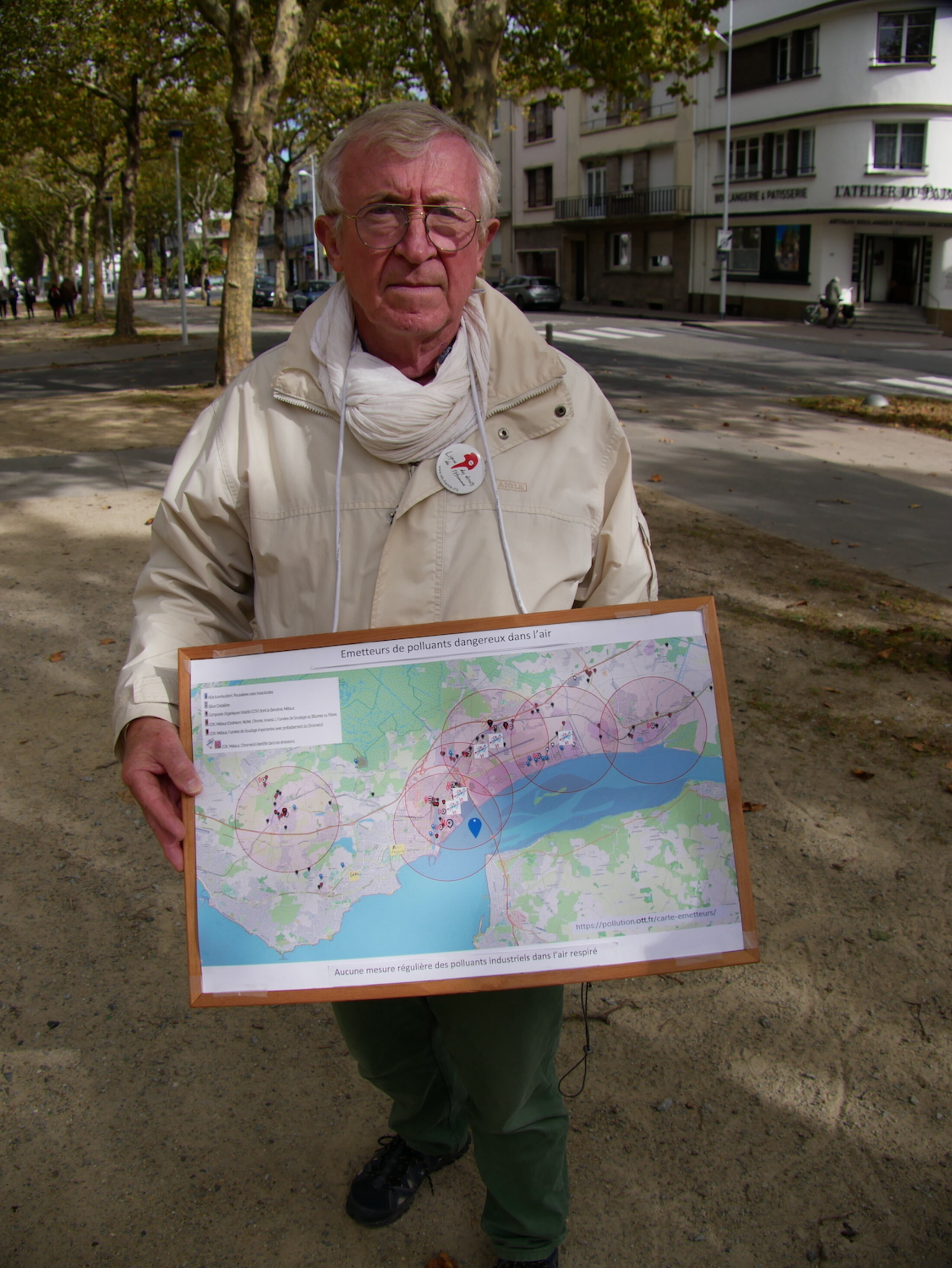 Quel crédit accorder à l’étude de zone si elle est réalisée à partir de données parcellaires et d’échantillons non représentatifs ? La question hante de plus en plus les associations de riverain·es. Pour Didier Ott, il faut continuer de montrer du doigt les pollueurs et faire pression sur les pouvoirs publics. L’ancien ingénieur informatique a répertorié toutes les sources de pollutions industrielles connues dans l’estuaire. À chaque manifestation devant la sous-préfecture, il déambule avec une grande carte des « émetteurs de polluants dangereux dans l’air » accrochée à son cou.
