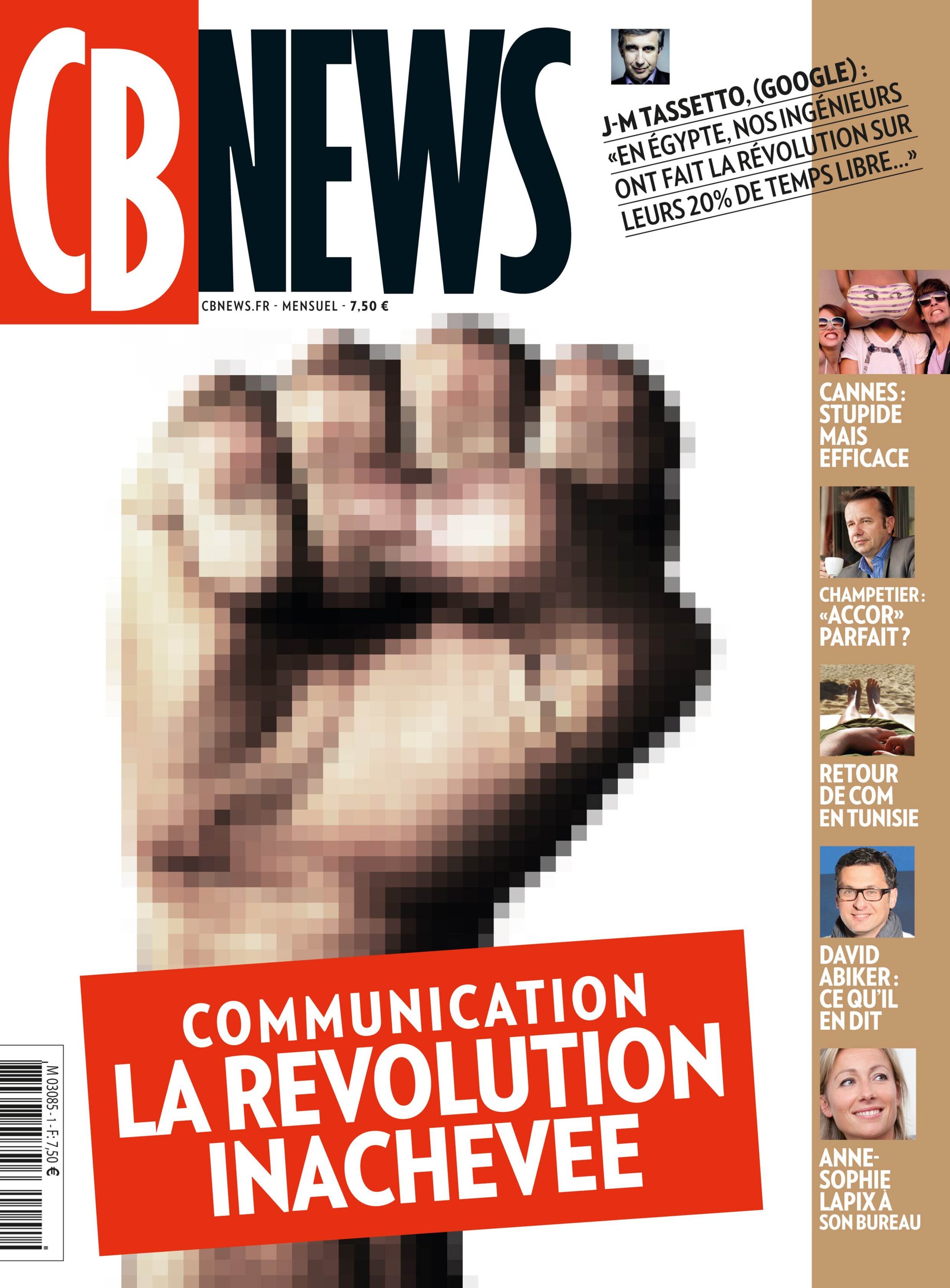 La révolution sera numérique, semble dire ce gros poing pixélisé en couverture du magazine CB News qui reparaît sept mois après sa liquidation judiciaire en novembre. En complément, cette citation du directeur général de Google France, Jean-Marc Tassetto: «En Egypte, nos ingénieurs ont fait la révolution sur leurs 20% de temps libre.» De fait, les ingénieurs de Google bénéficient bien (en théorie) d'une journée par semaine pour travailler à des projets personnels. Et un responsable de Google, Wael Ghonim, a bien été un symbole de la révolution égyptienne mais il était directeur marketing de Google Moyen-Orient. Peu importe, insiste le magazine: la mission de Jean-Marc Tassetto est «de redonner un air aimable à l'insatiable géant».