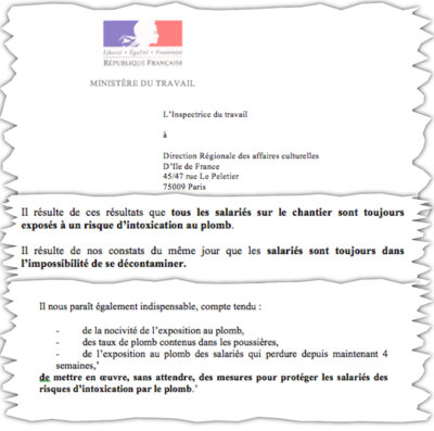 Malgré plusieurs rapports d’inspection alertant, depuis mai, sur les défaillances des installations de décontamination au plomb et les risques encourus par les salariés sur le chantier et aux alentours, le ministère de la culture n’a pas jugé bon d’intervenir. Contre son avis, le préfet de région Michel Cadot a imposé, le 25 juillet, la suspension du chantier, qui devrait reprendre vers le 16 août.