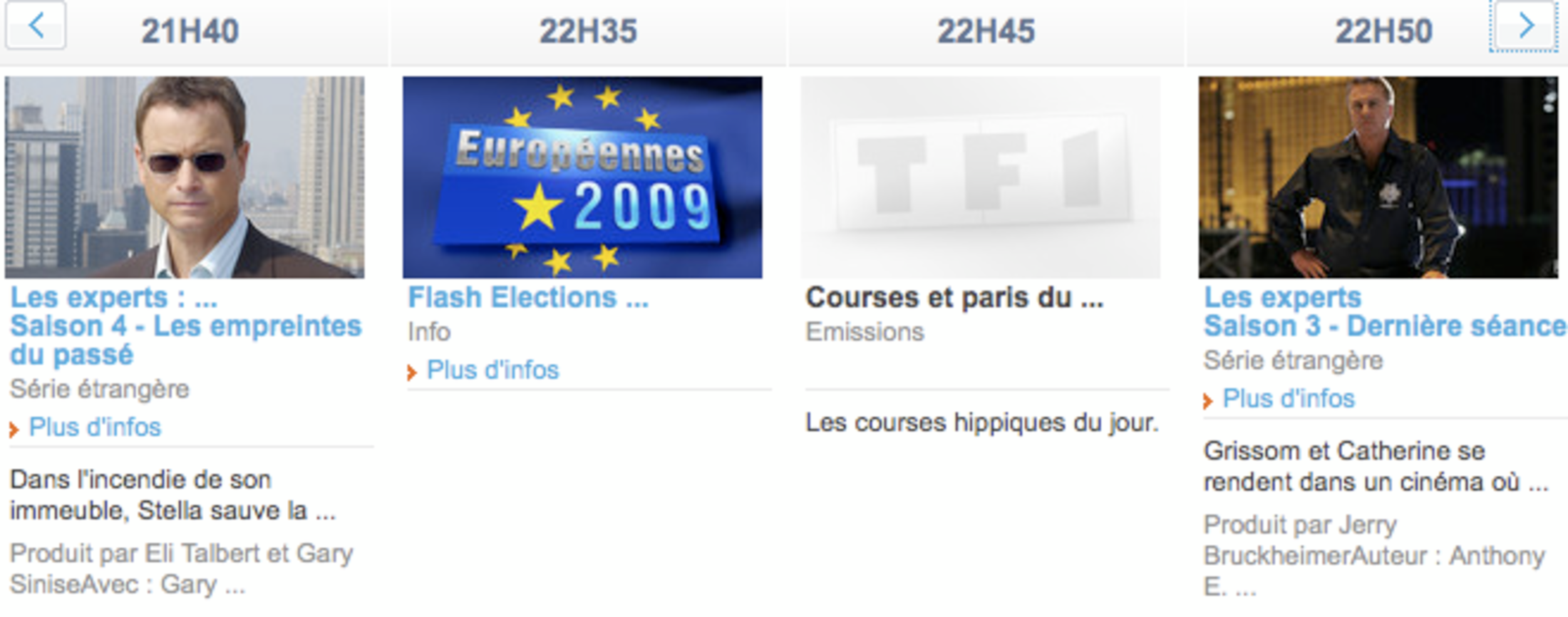 15h30. Alors que DailyMotion, 20minutes.fr et LeMonde.fr lancent leur soirée, première soirée électorale en vidéo [avec Jean-François Copé (UMP), Jack Lang (PS), Nicolas Dupont-Aignan (Debout la République), Nathalie Kosciusko-Morizet (UMP), Sylvie Goulard (Modem), Christophe Caresche (PS), Patrick Le Hyaric (Front de Gauche)...], TF1 consacre royalement 10 minutes entre «Les Experts» et le PMU aux résultats: