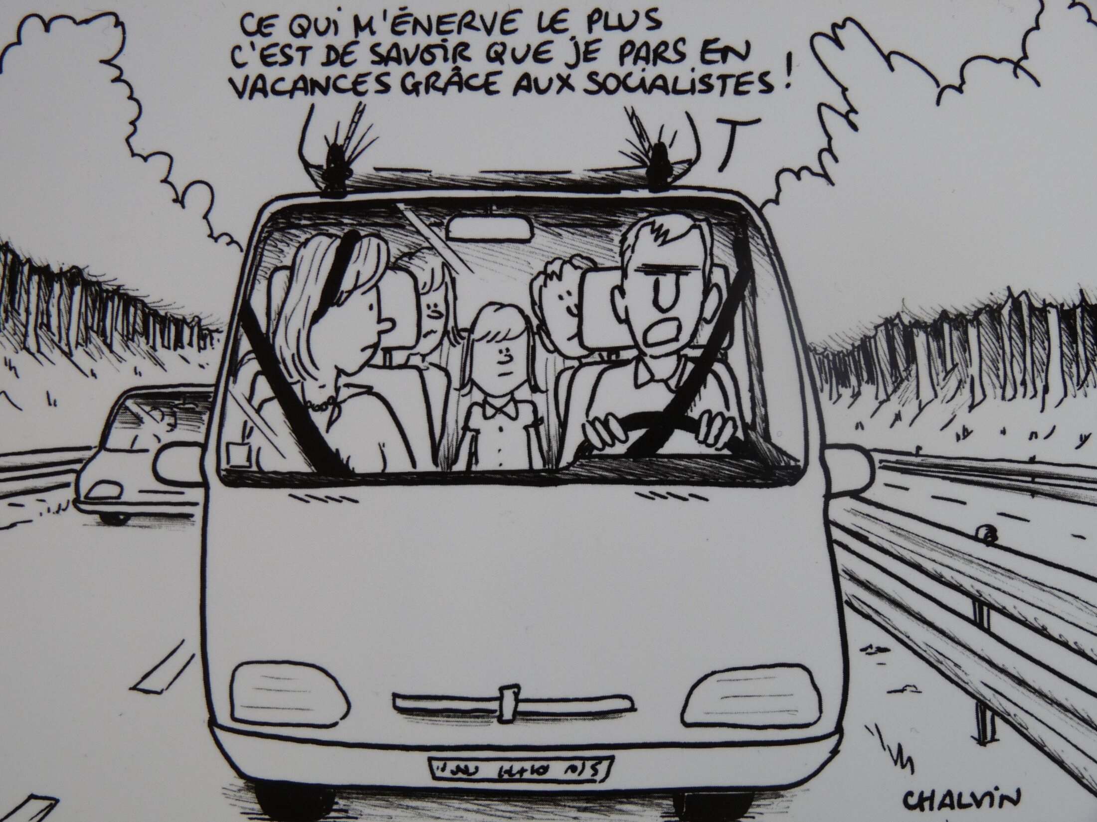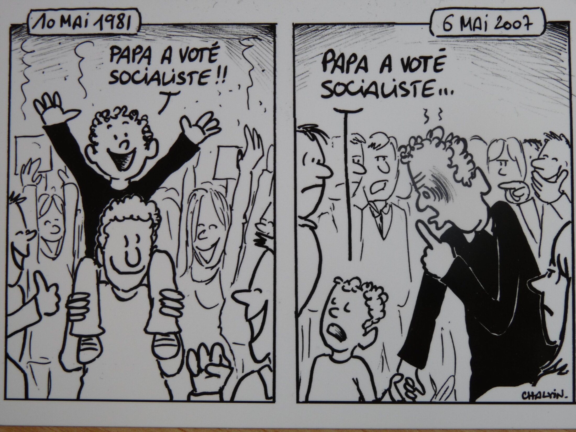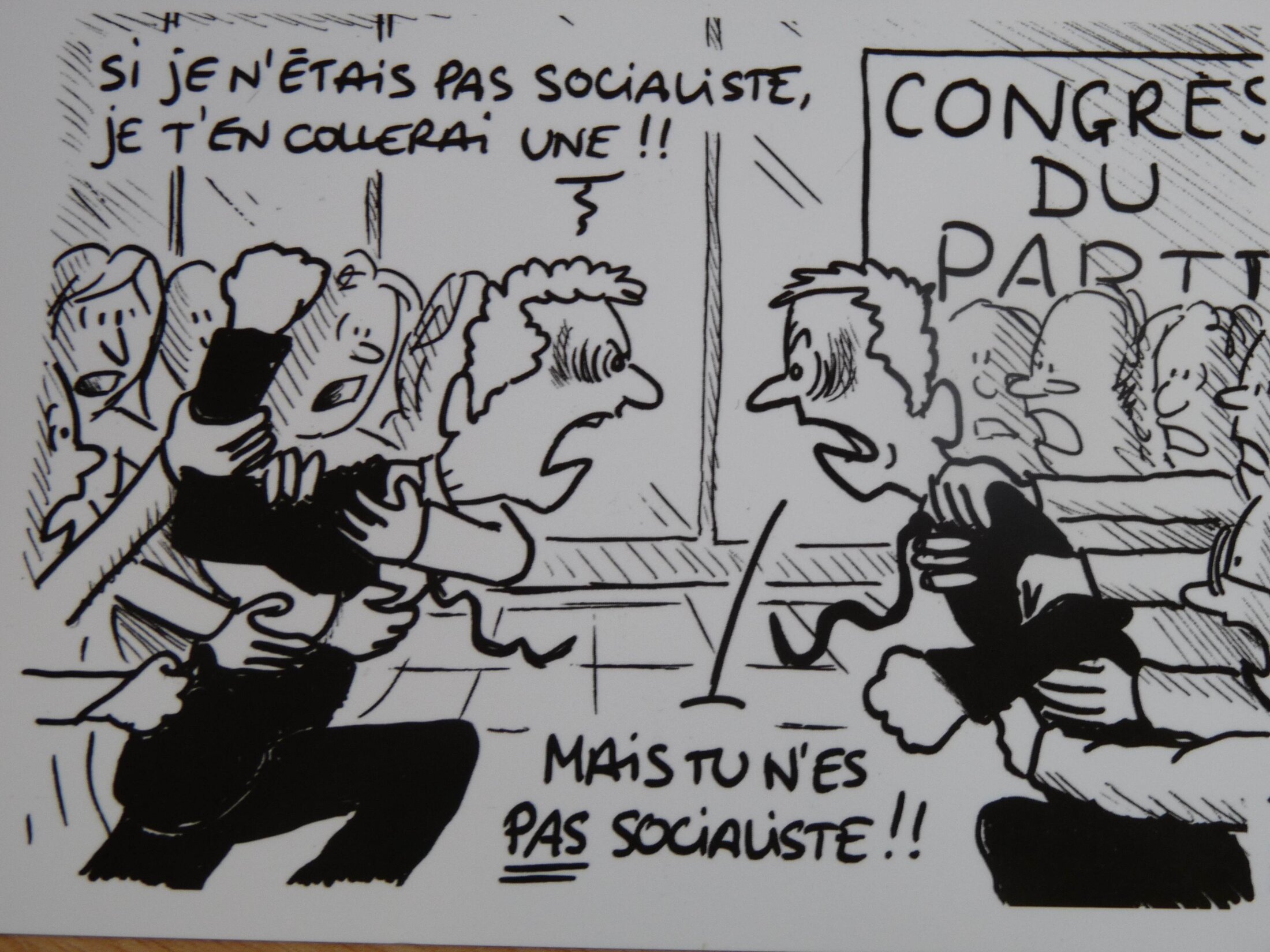 Pour se quitter dans la bonne humeur, une dernière caricature de Chalvin, carte postale photographiée sur le stand de l'Office universitaire de recherche socialiste…
