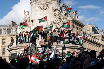 Plusieurs milliers de personnes se sont rassemblées, dimanche 22 octobre, place de la République, à Paris, pour dire leur solidarité à l’égard du peuple palestinien et dénoncer les bombardements de l’État d’Israël à Gaza.