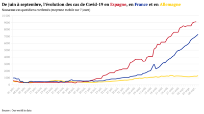 L’Europe de l’Ouest est frappée par une deuxième vague de coronavirus. Après l’Espagne, la France affiche désormais un haut niveau de circulation du virus et voit monter le nombre de ses cas graves hospitalisés. En Allemagne au contraire, la circulation du virus reste basse et contrôlée.