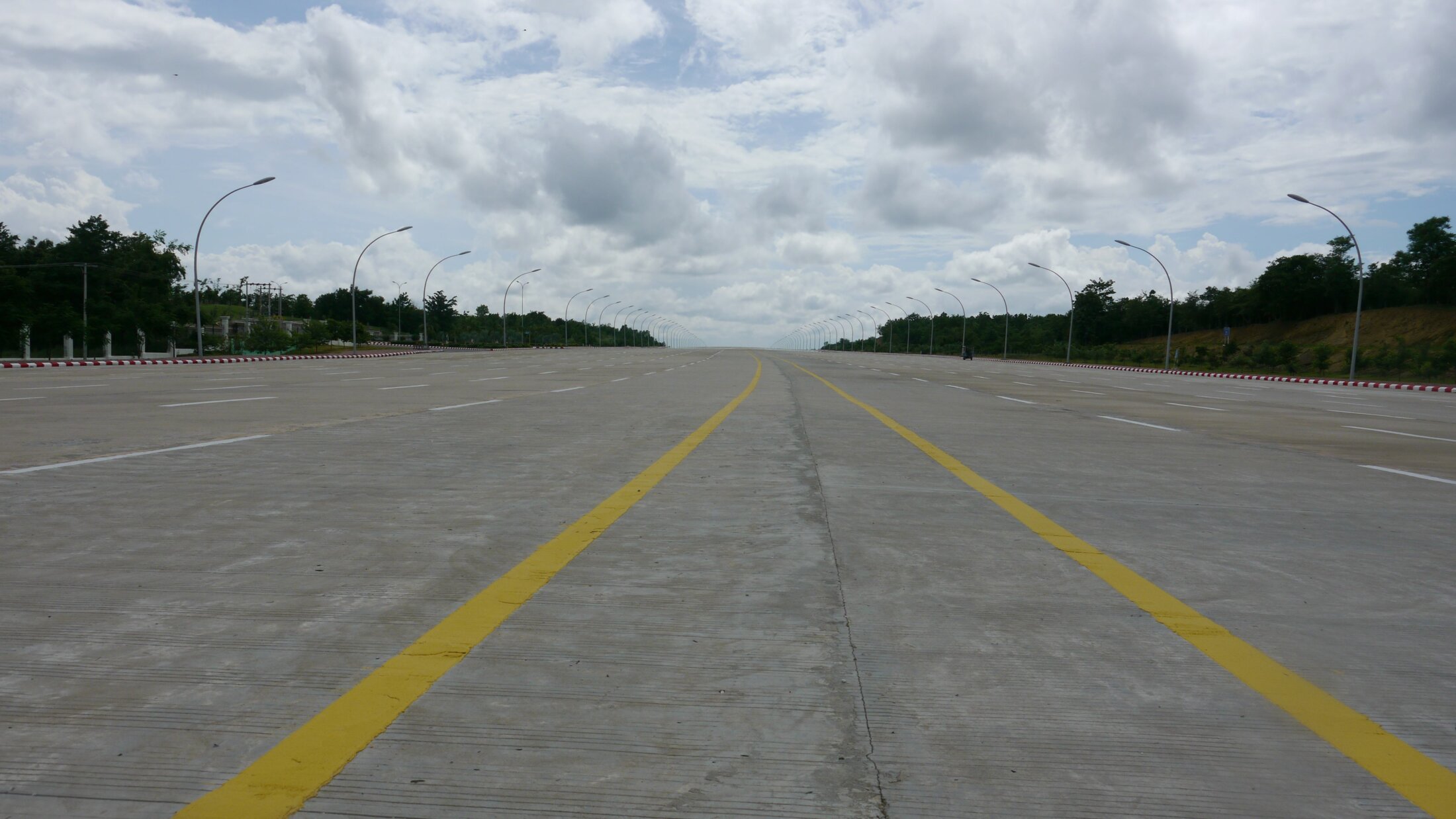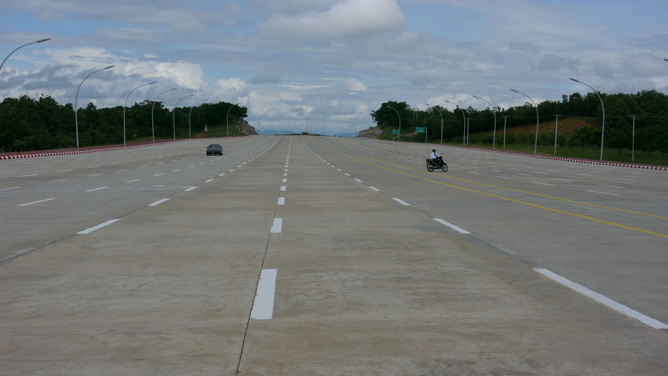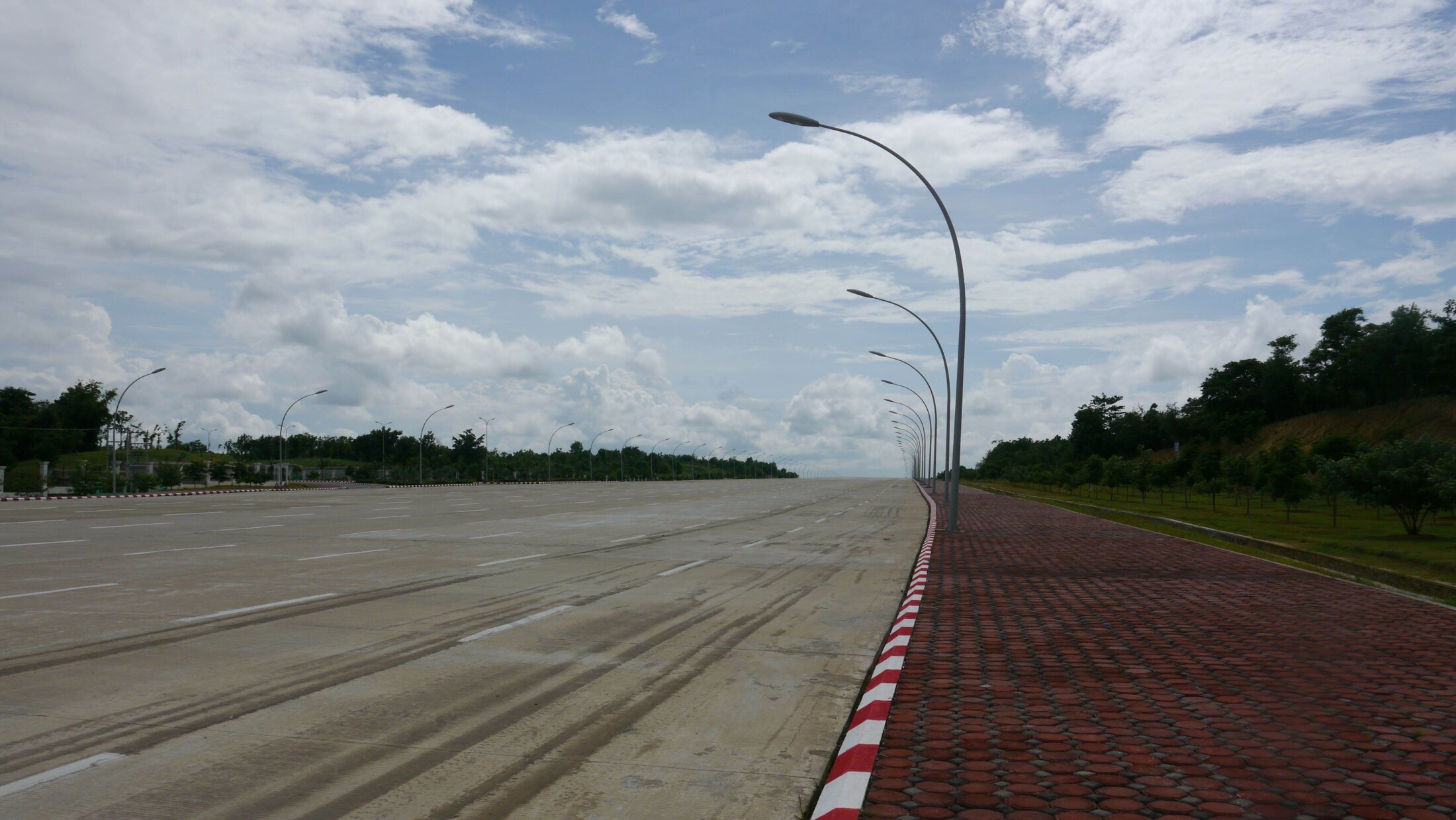 La route qui mène au Parlement est une route à vingt voies, « ridicule et stupide », en sourit Win Thein, qui semble davantage adaptée à des Boeing 787 qu'à de simples voitures. D’ailleurs, selon le policier de garde à la guérite qui interdit l'accès au parlement, il aurait dû s’agir d’une piste d’aviation, « mais les plans ont changé et c'est devenu une voie d'accès ». Une explication peu convaincante puisque la ville a été bâtie en cinq ans et qu’un immense aéroport international, lui aussi désert, a été construit au sud de la cité.