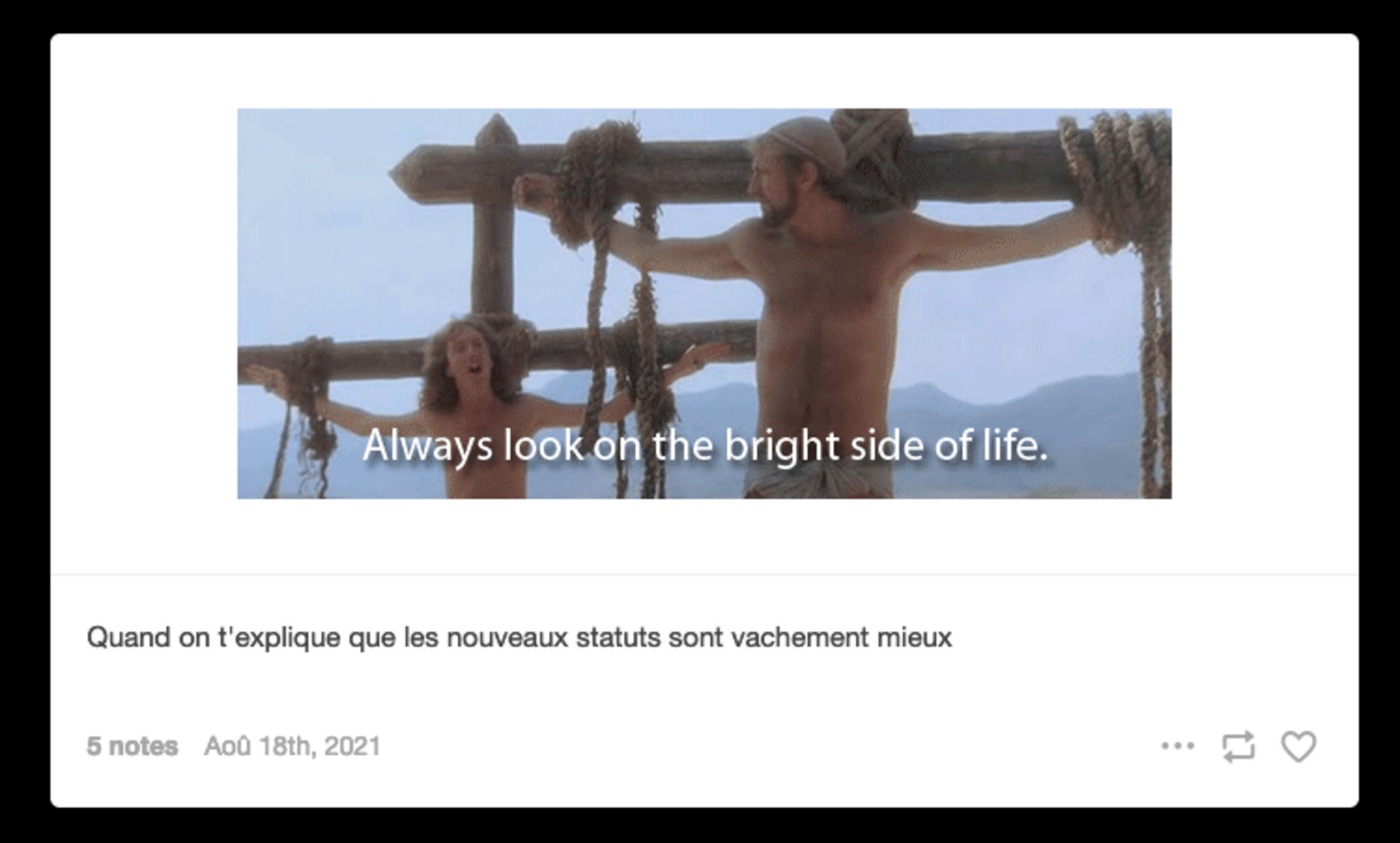 Sur la page Tumblr animée par FO, l’une des publications s’intitule : « Quand on t’explique que les nouveaux statuts sont vachement mieux. » L’image qui l’accompagne est un extrait du film La Vie de Brian, des Monty Python. On y voit Brian et plusieurs autres condamnés à mort par crucifixion se mettre, en dépit de tout bon sens, à chanter : « Always look on the bright side of life » (« Regarde toujours la vie du bon côté »).