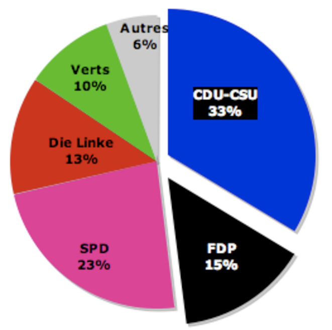 Selon les premiers résultats, la CDU-CSU — le parti d'Angela Merkel — obtiendrait 33,5 % des voix, devant le SPD (23,5%) et les libéraux (14,5%). Une coalition libéraux-conservateurs semble donc possible. Portrait de la chancelière qui vient de diriger l'Allemagne pendant quatre ans avec les sociaux-démocrates.