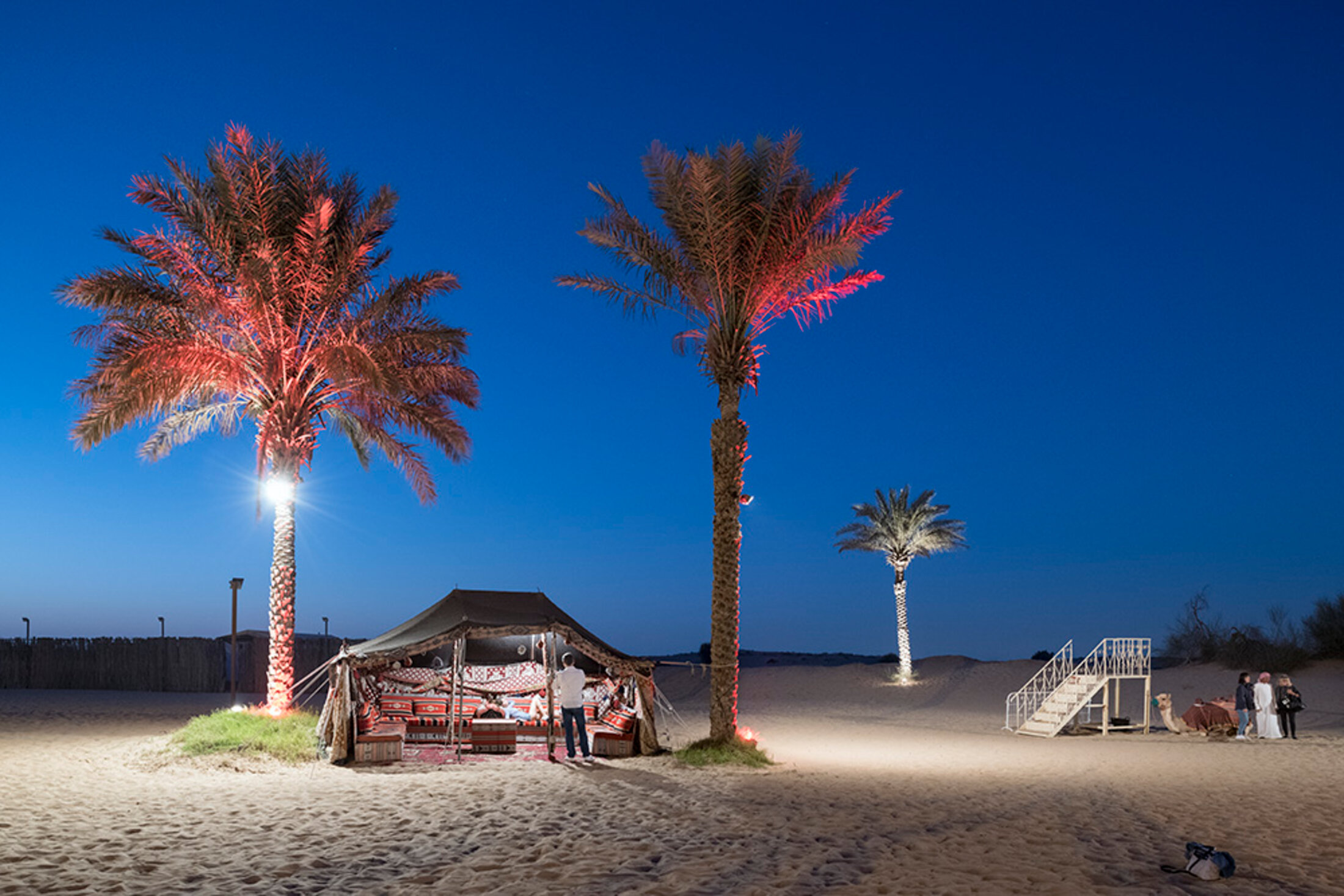 2 janvier 2018. Le Jebel Ali Al Sahra Desert Resort et son centre équestre d’inspiration bédouine, à la nuit tombante.