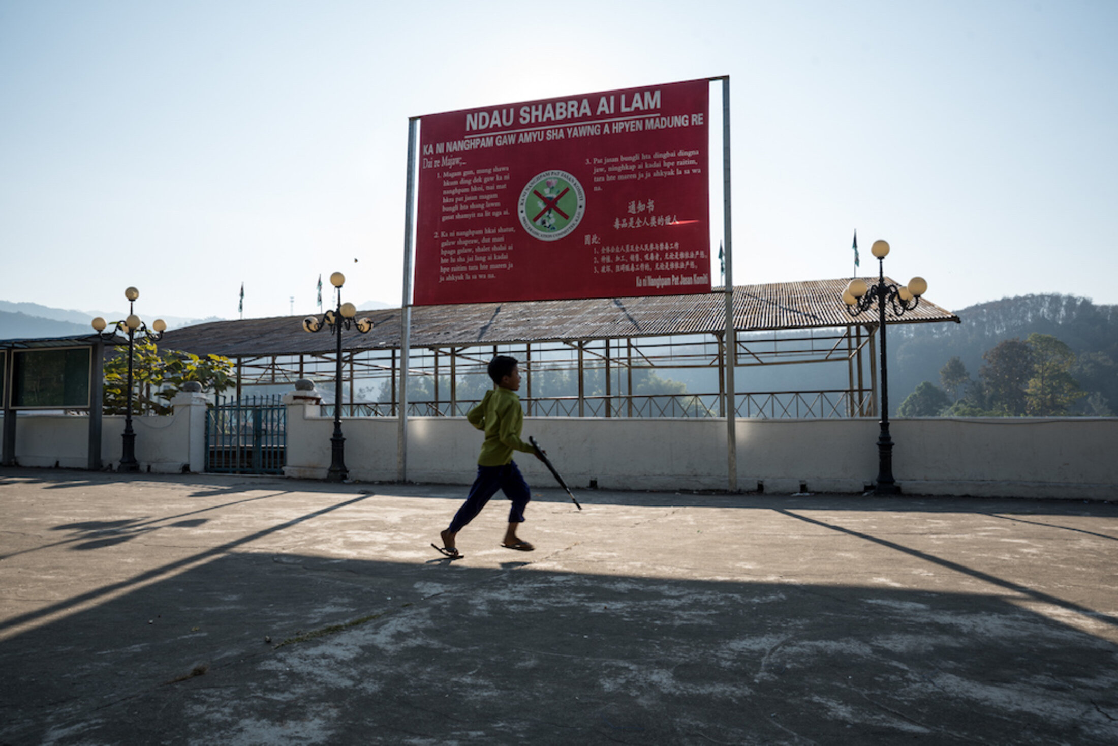 Laiza, janvier 2018. Un panneau du comité local Pat Jasan rappelle l’interdiction d’utiliser des drogues à Laiza, la principale ville contrôlée par la Kachin Independence Organization (KIO). Le mouvement Pat Jasan, dont le nom signifie « Empêcher et détruire » en kachin, a été lancé en 2010 sous l’égide de la KIO dans les territoires qu’elle contrôle. En 2014, grâce à l'appui des églises locales, le mouvement s’est étendu au reste de l’État Kachin. Son action reflète les profonds désaccords politiques entre la KIO et le gouvernement birman, accusé d’inaction.