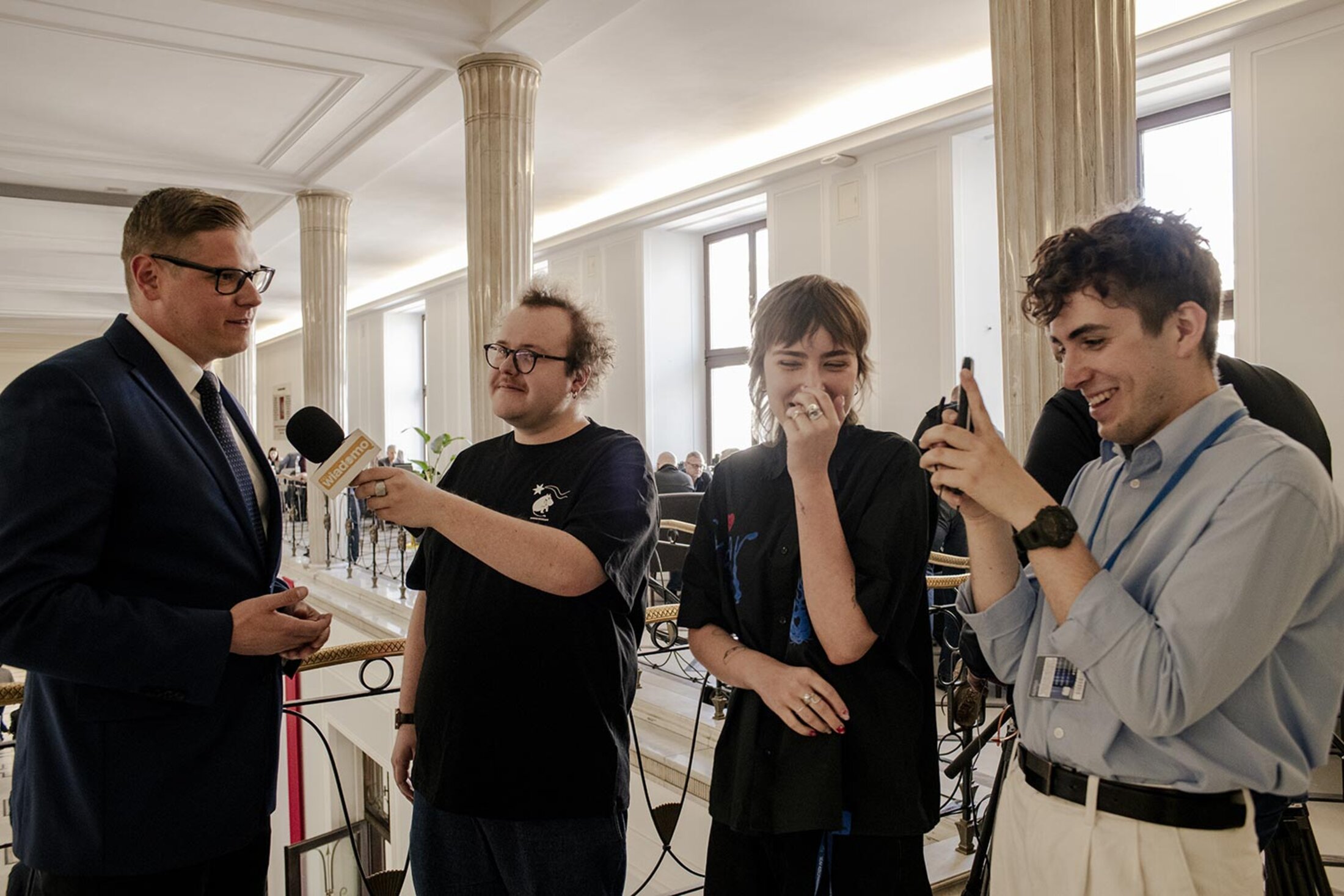 Varsovie, Pologne, le 8 mai 2025.Aleksander Lipski-Reinstein, 24ans, à gauche, etJulia Swiech, 24ans, au milieu, pendant le tournage de leur émission politique, «Nowiadomo» («Bien sûr, c’est connu»), durant laquelle ils posent des questions assez surprenantes, parfois drôles, à des politicien·nes, toujours en rapport avec des événements politiques ou sociaux actuels. Ils filment pour les réseaux sociaux, mais l’émission est également diffusée le samedi soir par la principale chaîne de télévision publique polonaise, TVP.