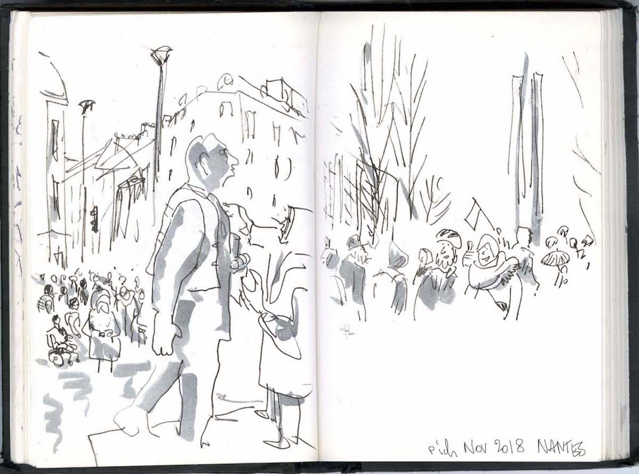 Depuis le début du mouvement des « gilets jaunes », Pich’ (dessinateur nantais, qui a notamment participé au Fabuleux furieux, hommage en Freak Style, éd. Les Requins Marteaux) croque les manifestations. Il a été rejoint récemment par Cyril Pedrosa (auteur notamment de L’Âge d’or, éd. Dupuis) et Loïc Sécheresse (auteur notamment de Heavy Metal, éd. Gallimard BD). Compilation de leurs carnets de dessin.