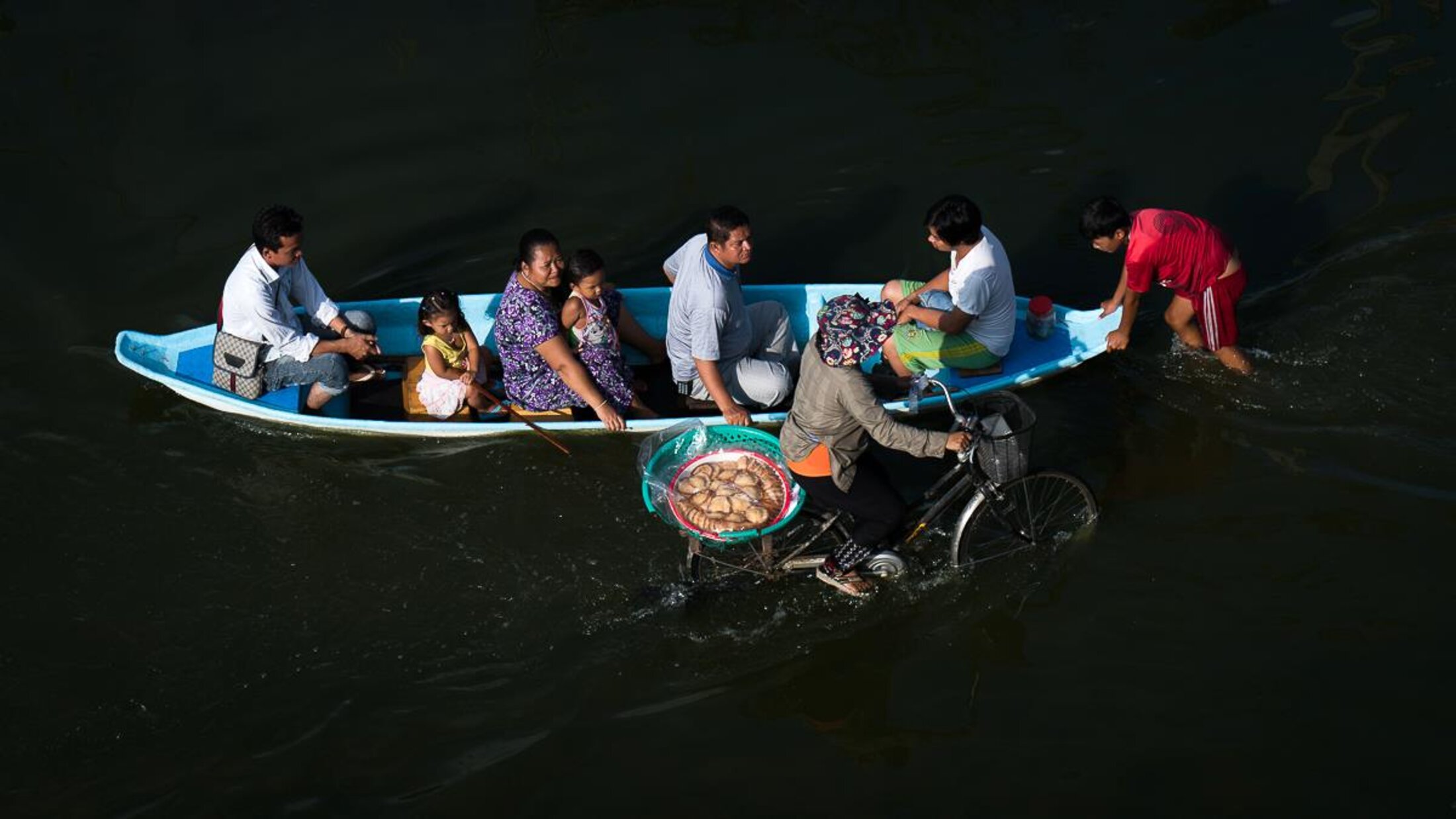 l ne peut consacrer tout son temps à la photographie et doit gagner sa vie pour subvenir aux besoins de sa famille. Son point de vue sur les inondations est tout à fait original. Depuis son balcon, utilisant l’eau comme un fond noir – mais empli de détails –, il saisit de petites scènes de cette vie ralentie par la montée des eaux. Comme une forme de théâtre de la vie quotidienne. Pourtant, nous dit-il, « l'urbanisation de Phnom Penh fait que le Mékong sort de plus en plus souvent de son lit, et pas seulement pendant la saison des pluies. Depuis 2011, les effets du changement climatique rendent les crues de plus en plus fortes ». Les photographies de Ly Ming sont exposées jusqu’au 18 novembre au festival Photo Phnom Penh, rendez-vous important de la photographie en Asie du Sud-Est.