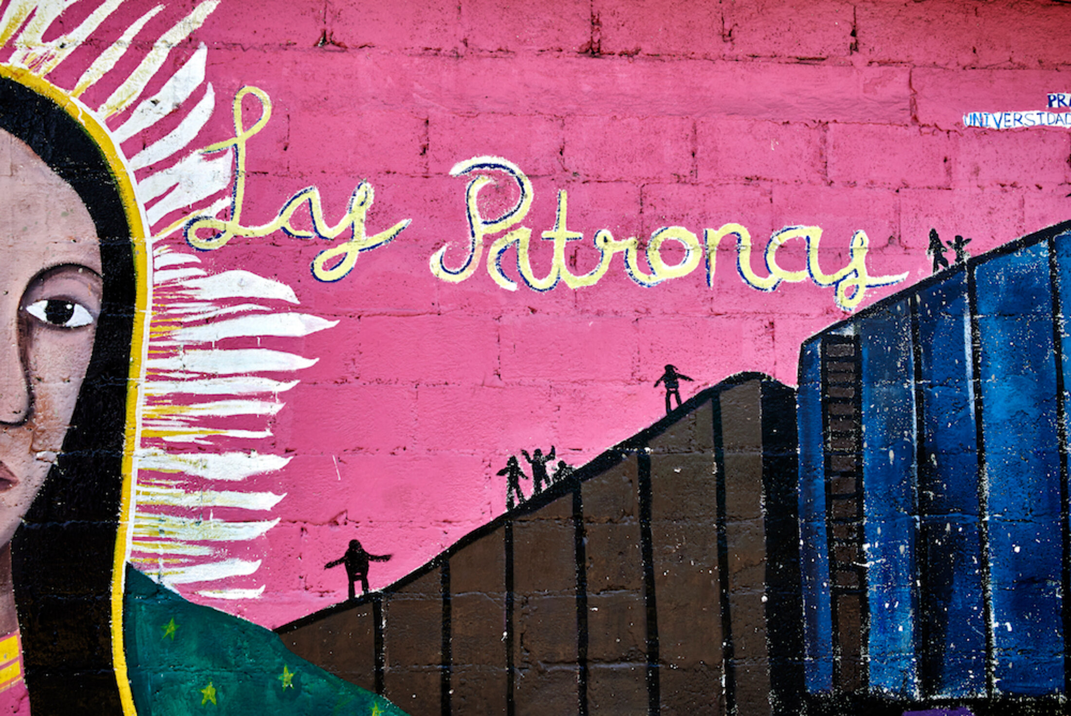 Mur du refuge de las Patronas. C’est au sein d’une ancienne usine d’huile, transformée en refuge, que les Patronas cuisinent les précieux sacs de nourriture. Sur cette façade a été peinte la Vierge Marie et, en fond, le fameux train de marchandises nommé la Bestia, avec des migrants sur ses wagons.