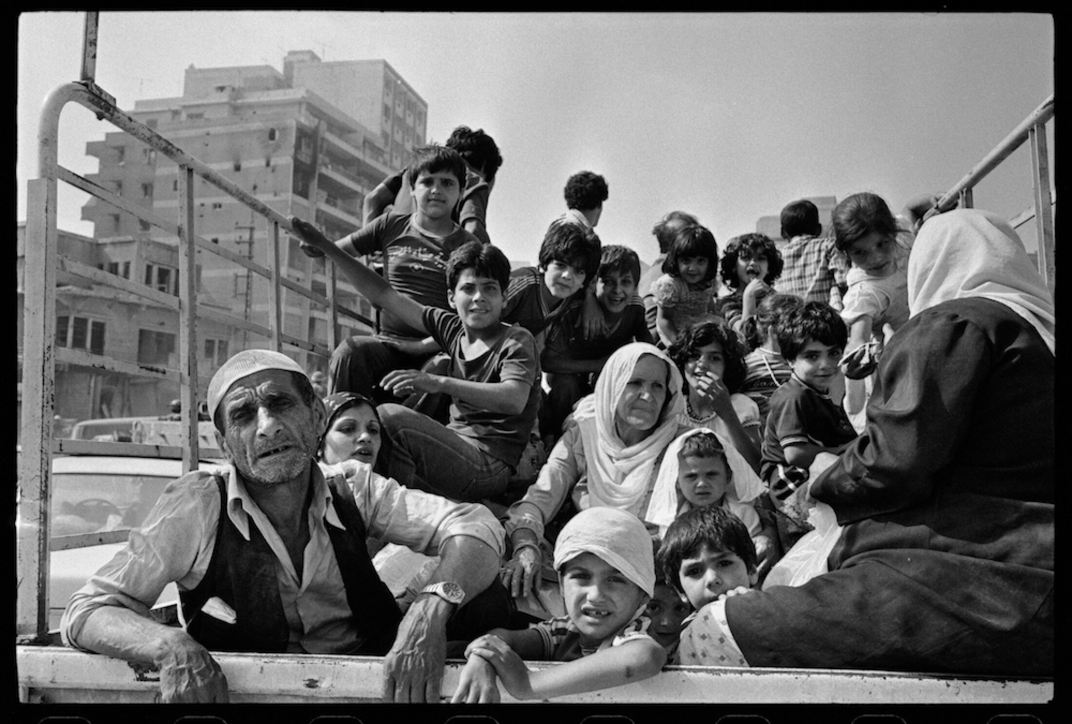 Saïda, Sud-Liban, juin 1982. L’invasion israélienne du Liban – l’opération « Paix en Galilée » – se déroule du 6 juin au 29 septembre 1982. Après d’intenses bombardements début juin des villes côtières de Saïda et de Tyr – places fortes des mouvements palestiniens –, les civils palestiniens rejoignent la ville de Beyrouth, tenue par une coalition des forces syriennes, palestiniennes et du mouvement chiite Amal.