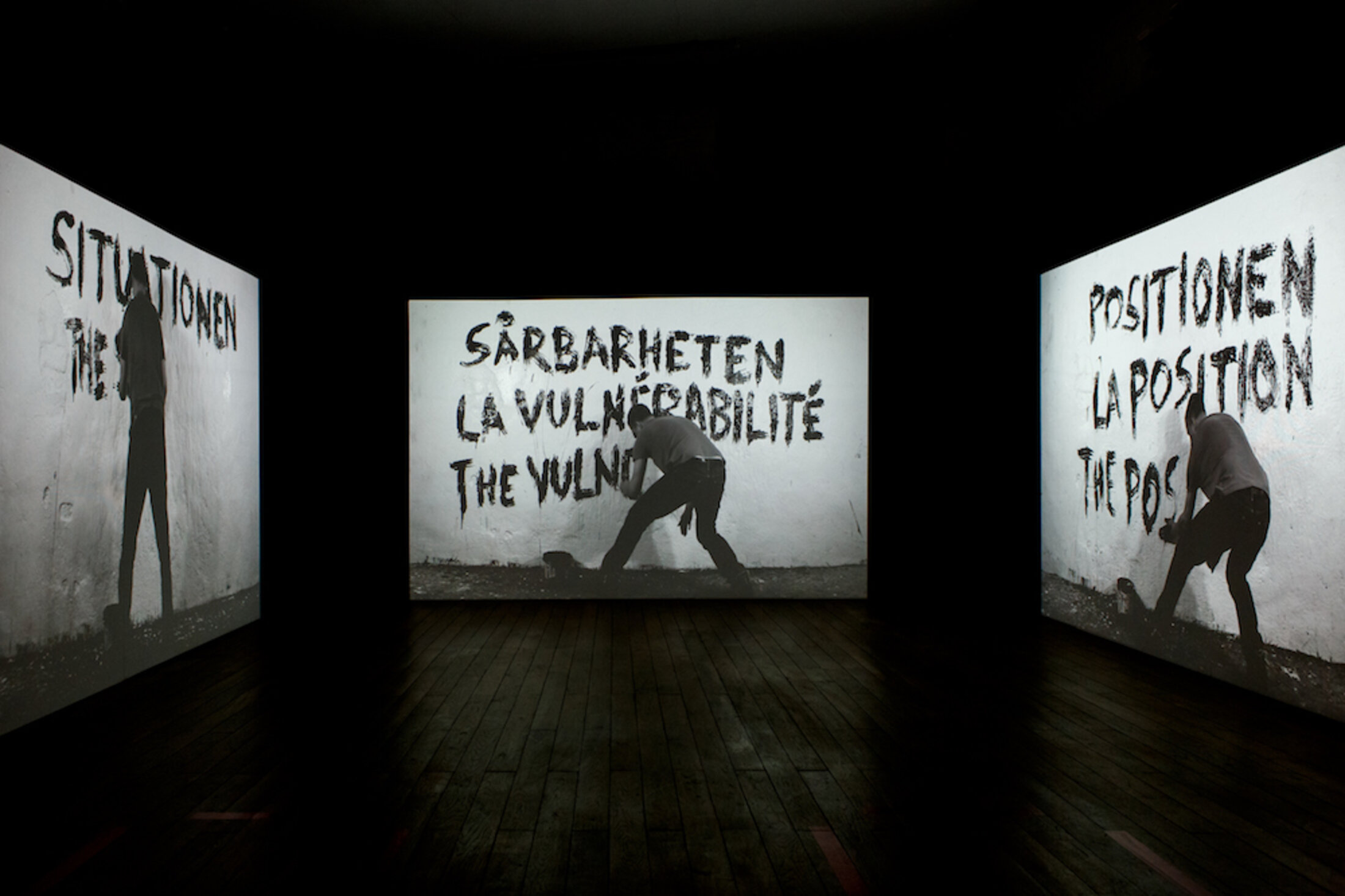 Ordet/Le Mot/The Word (2017). Installation de l’œuvre vidéo au premier étage de la Villa Pérochon. JH Engström s’est filmé en train d’écrire avec sa main plongée dans un pot de peinture noire 160 mots dans les trois langues qu’il parle : le suédois, le français et l’anglais. Des mots précis et abstraits (“vulnérabilité”, “culpabilité”, “interprétation”, “humiliation”, “espoir”…), « mais qui sont en fait très personnels, explique le photographe. Chaque mot évoque en nous une image et cette image nous est propre. Cette vidéo est un travail de réflexion que j’offre à chacun ».