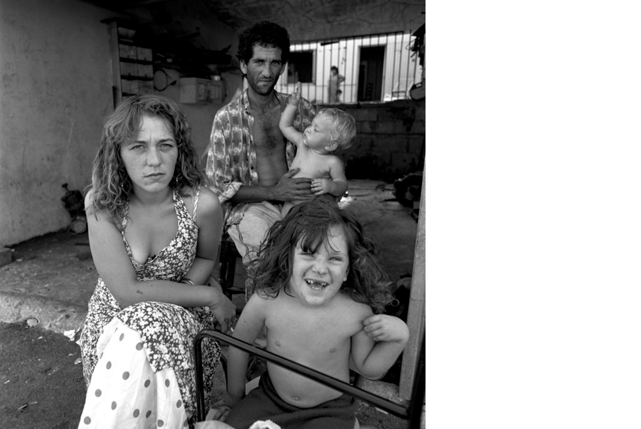 Une famille devant son garage. Le garage est le lieu où les familles passent le plus de temps. On y répare la voiture, mais on y mange également parfois. Patricia, la mère, avec ses deux enfants et son compagnon.