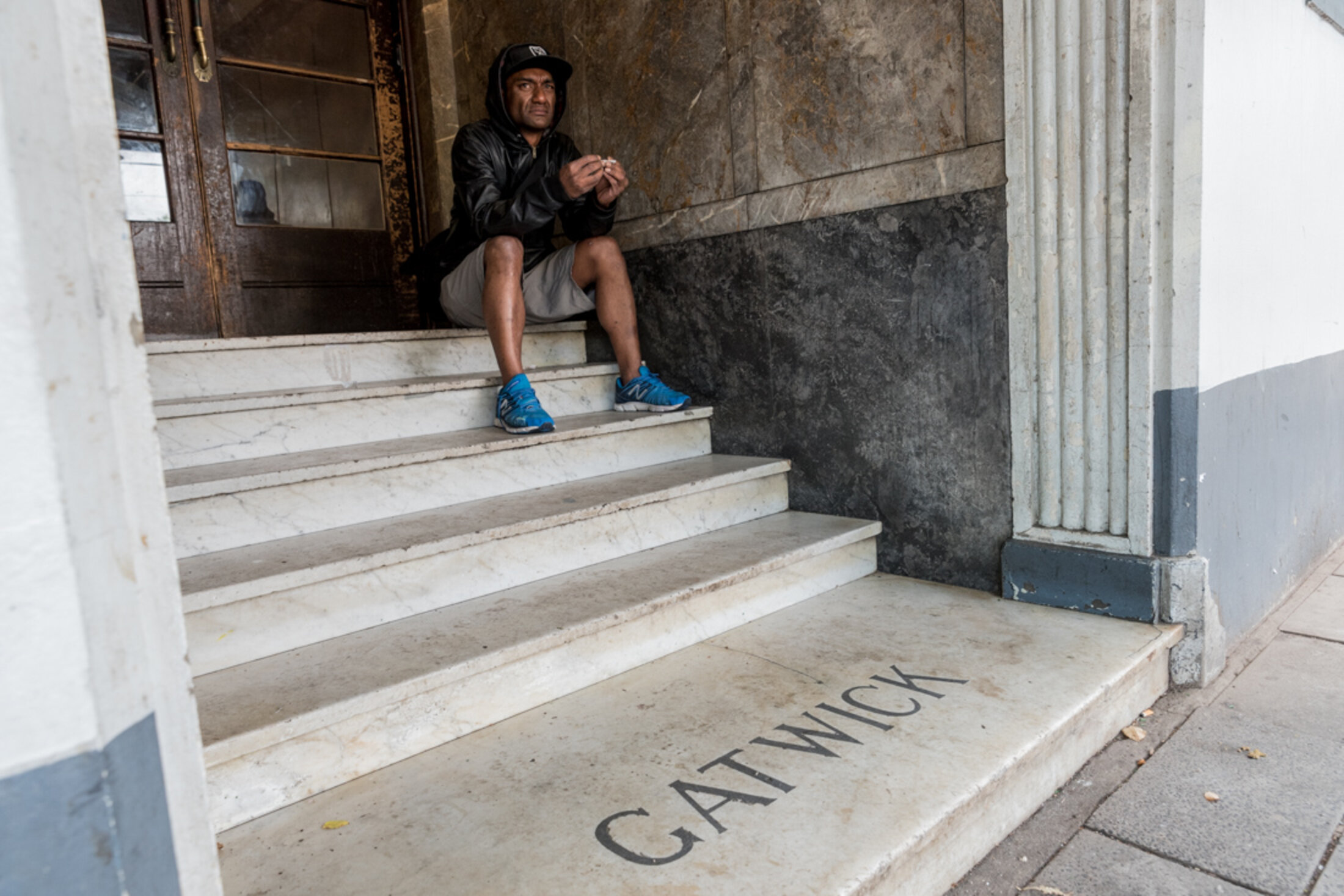 Février 2017. Avant sa fermeture définitive en juillet 2017, le Gatwick affichait complet presque chaque nuit et hébergeait une centaine de personnes. Certaines n’y passaient que quelques jours, disparaissaient et réapparaissaient au gré des aléas de la vie, d’autres y ont trouvé une maison pour des années, voire des décennies. Dave, des îles Fidji, dort au Gatwick par intermittence depuis trois ans. « On est chanceux d’avoir un toit et des repas gratuits. »« J’adore les documentaires animaliers, ici on est comme les animaux, on chasse l’argent dans les rues. »Quelques semaines aprèscette photo, il sera envoyé en prison à la suite d’une altercation violente au Gatwick. Certains le disent innocent, il aurait couvert quelqu’un.