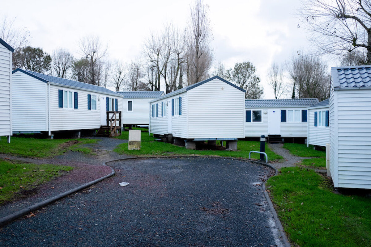 11 novembre 2019. Les mobile homes sont entassés les uns à côté des autres sur la base-vie des Pieux (Manche), ville de 3 150 habitants dont 10 % aujourd’hui sont des « déplacés ». La construction de l’EPR a bientôt dix ans de retard. Nombreux sont les travailleurs qui vivent depuis des années dans ces baraques sommaires. Certains sont en colocation avec une chambre chacun et une kitchenette à partager pour seuls espaces de vie.