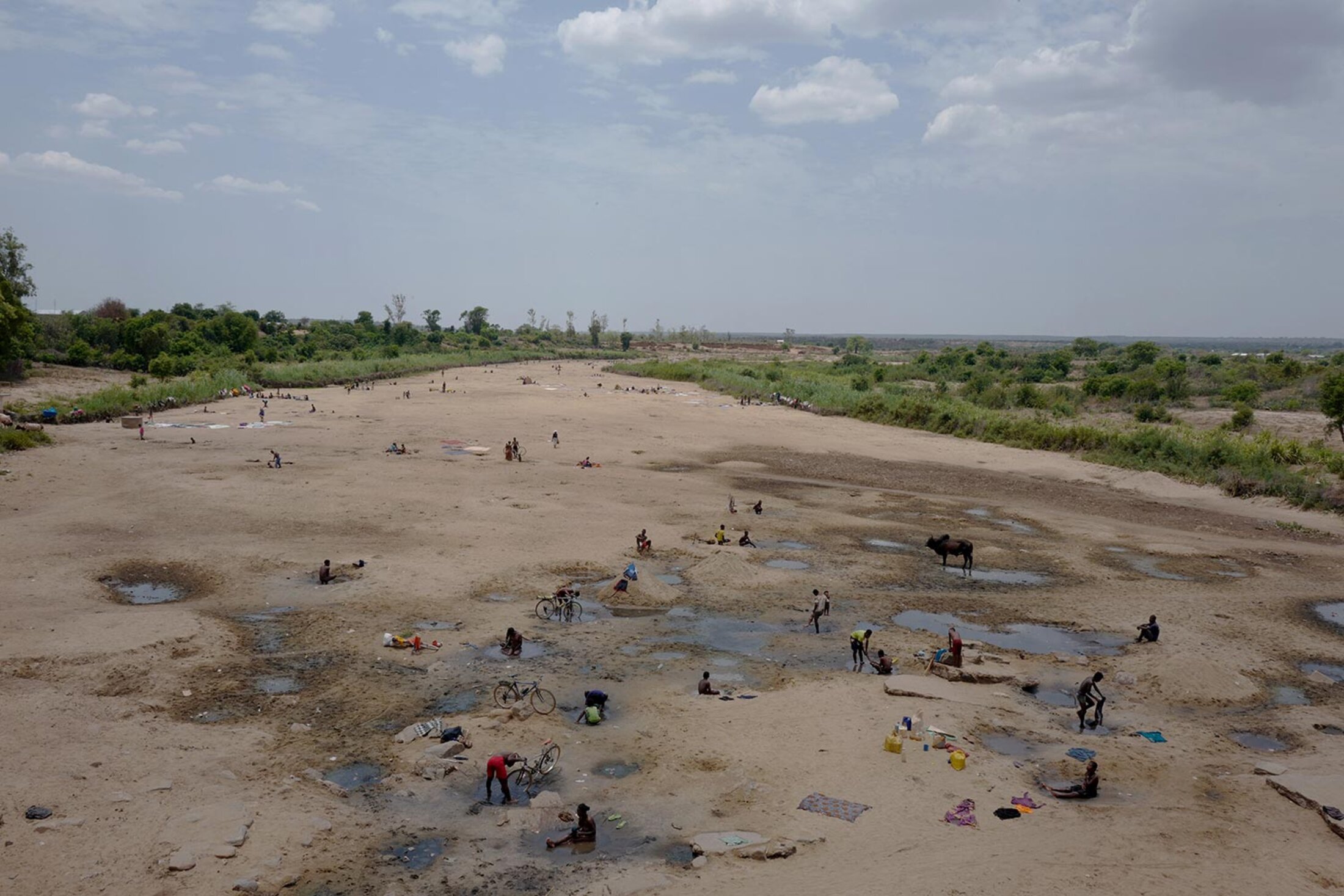 Tsihombe (Madagascar), décembre 2024. Sur le lit du fleuve asséché Manambovo, des centaines de personnes viennent chaque jour creuser le sol à la recherche de quelques litres d’eau, pour leur consommation personnelle ou la revente. D’autres creusent pour se laver, nettoyer leurs vêtements et leur vaisselle, ou pour abreuver leur bétail.