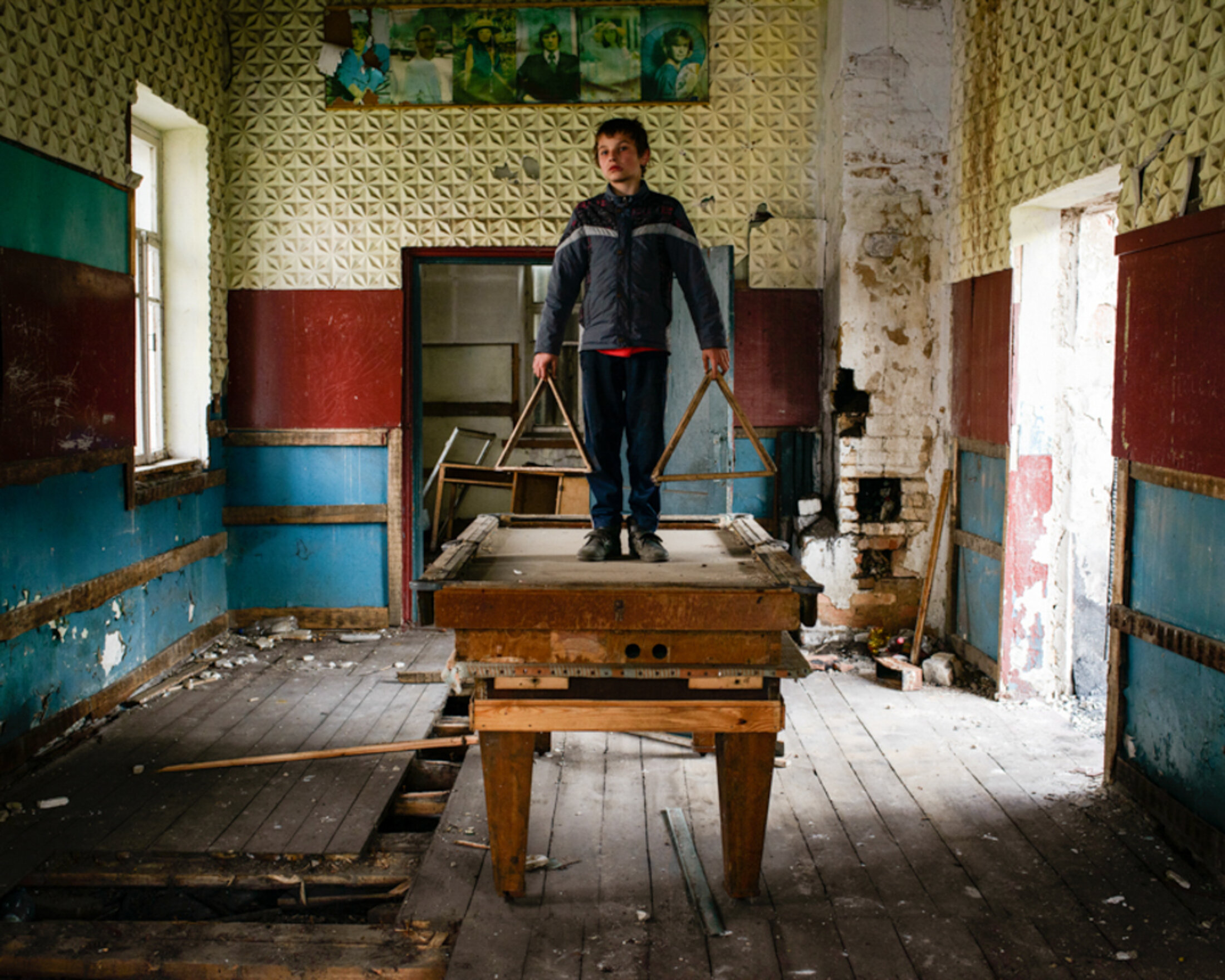 Bazar, octobre 2018. Sacha, 10 ans, joue dans les ruines de la maison de la culture de la ville de Bazar, située dans la zone interdite de Tchernobyl. La mairie aide les personnes à s’installer ici en échange d’une maison. En 1986, il y avait 2 500 habitants ; en 2005, 230 ; aujourd’hui, plus de 500.