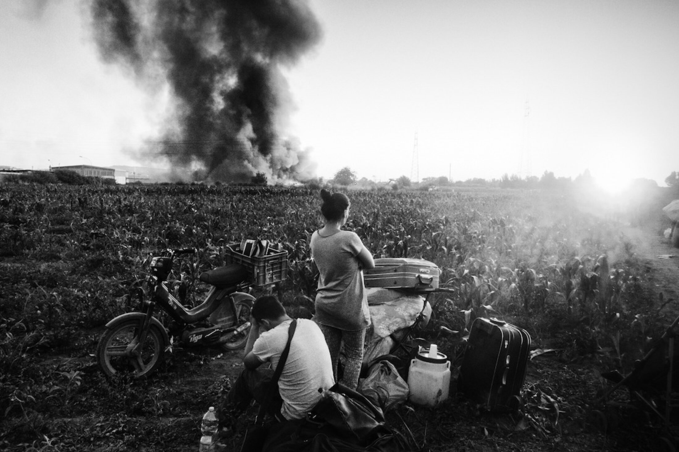 Naples, juillet 2016. Des Roms regardent leur camp, entouré de fumée toxique provenant de feux de déchets.