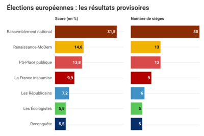 Dimanche, le Rassemblement national a obtenu plus de 30 % des voix, très loin devant le parti présidentiel, sévèrement sanctionné. Le président de la République a suivi la demande de l’extrême droite en annonçant des élections législatives les 30 juin et 7 juillet.