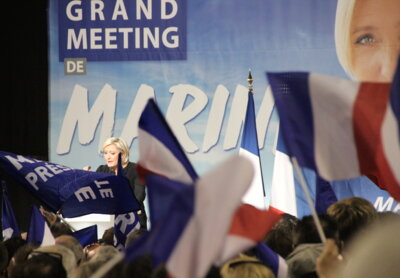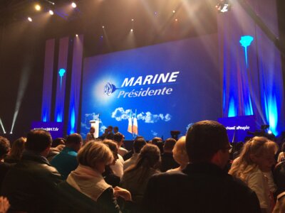 Lundi 17 avril au soir, la candidate du Front national a rassemblé des milliers de convaincus au Zénith de Paris autour des fondamentaux de l’extrême droite. À l’extérieur de la salle, quelque 150 militants antifascistes ont tenté de perturber son rendez-vous, sans succès.